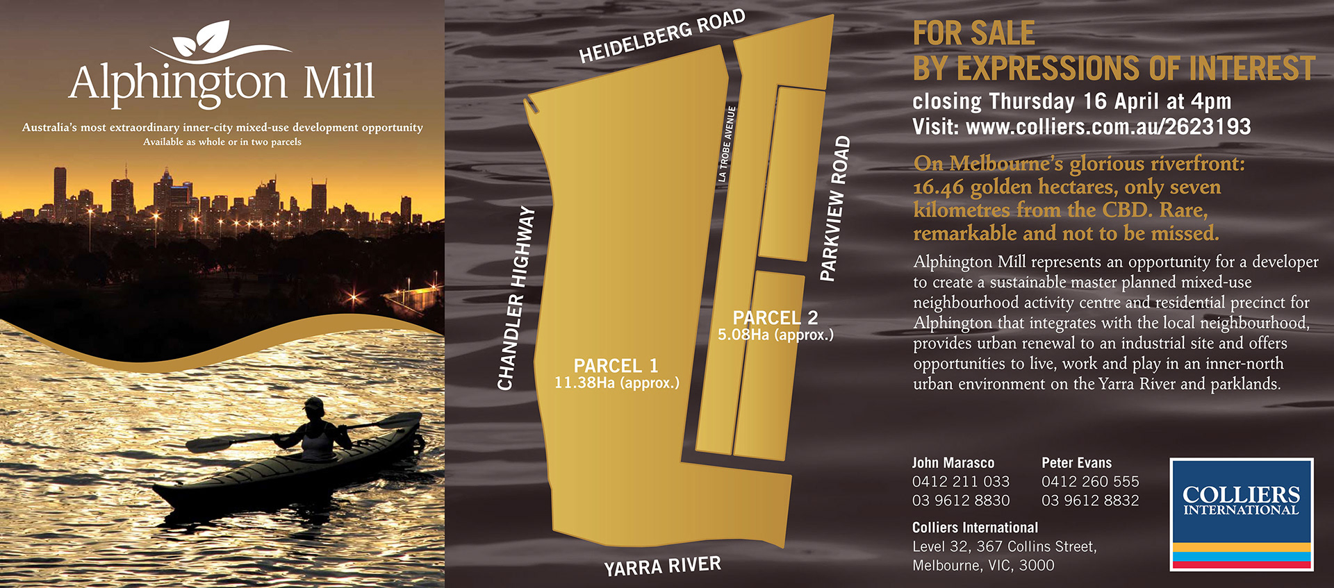 The sale and marketing of Heidelberg Road and Chandler Highway, Alphington, Victoria. This campaign needed a complete re-envisioning of the development site (formerly the Amcor site). I created this identity to symbolise the open parklands and proximity to the Yarra. 'Australia's most extraordinary inner-city mixed-use development opportunity.' Materials executed included information memorandum, website, video, print and signage. The gold colour palette was to attract the Asian market.
