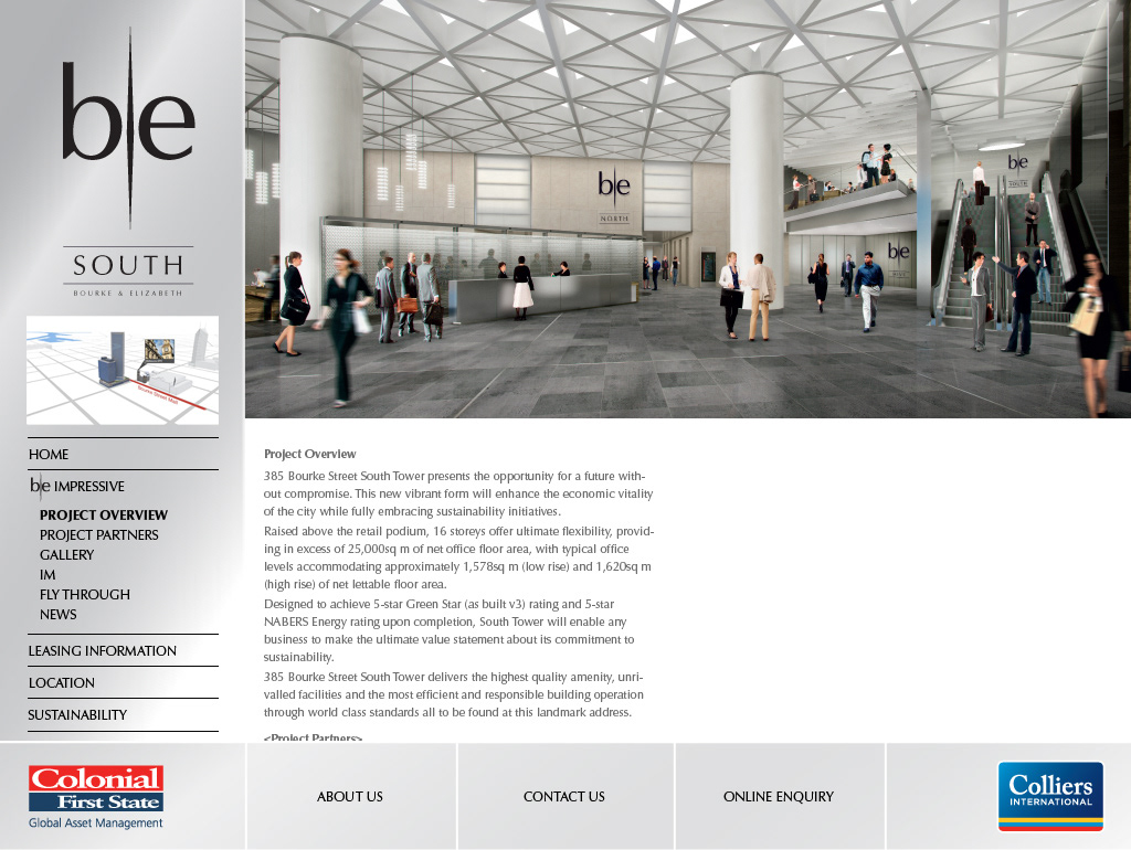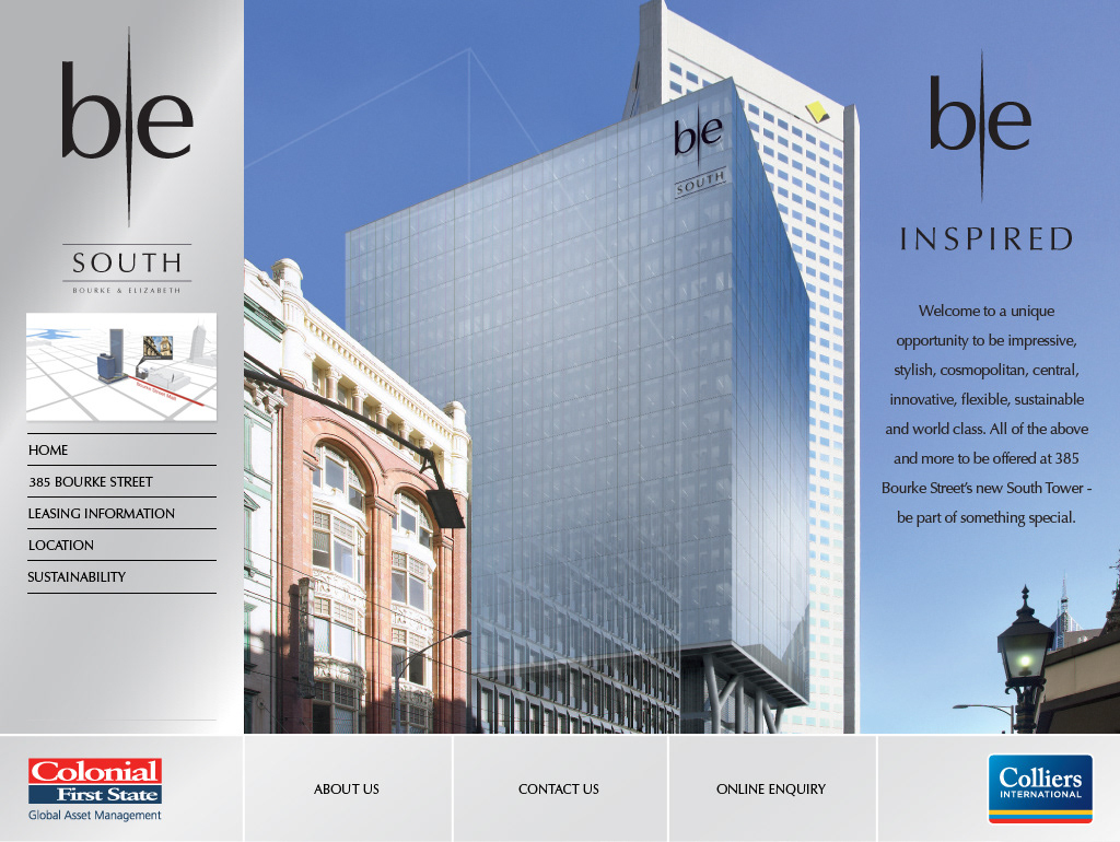 The leasing and marketing of 385 Bourke Street's South Tower, Melbourne, Victoria - b|e. The corner of Bourke & Elizabeth Streets b|e presents its new tenants with a rare opportunity to ‘be’ something special. The b|e corner location has the potential to own the name and the geographical location in the heart of the CBD. bIe CREATIVE, bIe INSPIRED, bIe INNOVATIVE, bIe CENTRAL, bIe COSMOPOLITAN, bIe GREEN, bIe IMPRESSIVE, bIe WORLD CLASS. Materials executed included a website, video, information memorandum, signage and print ads.