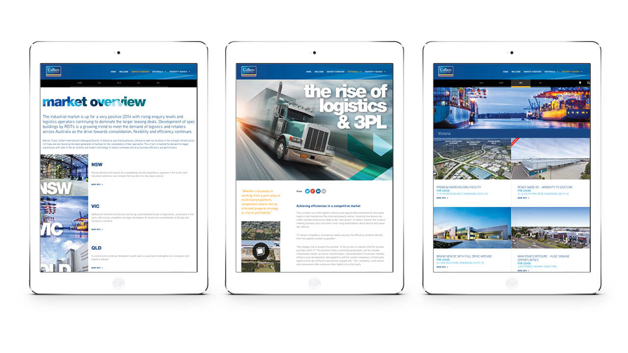 A National Industrial Property Portfolio and market overview campaign for Colliers International. The Portfolio showcases new and existing warehouses available for sale or lease across Australia and consisted of an interactive website on all devices, email communications and print publications yearly.